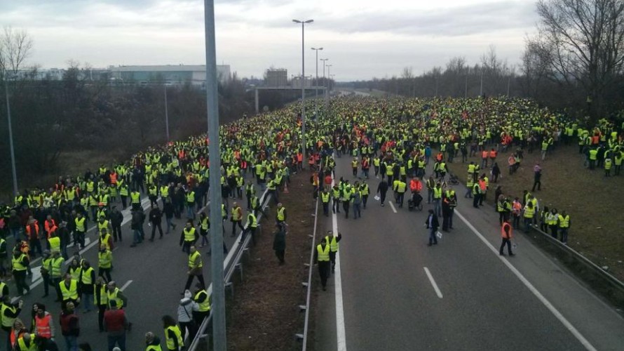 C’est une image postée le 17 novembre à 23H43 sut Twitter. Le samedi soir de la première journée de mobilisation donc. Un message : « Bonjour Emmanuel Macron, Juste pour en avoir le cœur net : combien voyez-vous de #GiletsJaunes sur cette image ? » La photo qui l’accompagne est impressionnante. Des centaines d’hommes et de femmes en gilets phosphorescents, qui débordent sur des voies d’autoroutes vidées de leurs voitures. Ils sont sur le bitume, sur le terre-plein central, sur les bas côtés. Le photographe est un peu en hauteur, sûrement sur un pont. Il nous permet de voir la scène d’en haut. Et d’appuyer ainsi la perspective. Les deux voies toutes droites semblent infinies. Le point de fuite est au centre de l’image. Et les manifestants semblent innombrables eux-aussi.