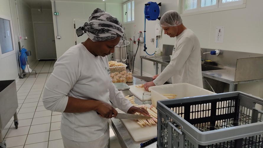 Ce matin-là, deux salariés coupent des têtes d’asperges et les mettent en bocaux avec de la saumure pour en faire des pickles. Autrement, ces asperges auraient dû finir à la poubelle, car elles sont hors calibre.