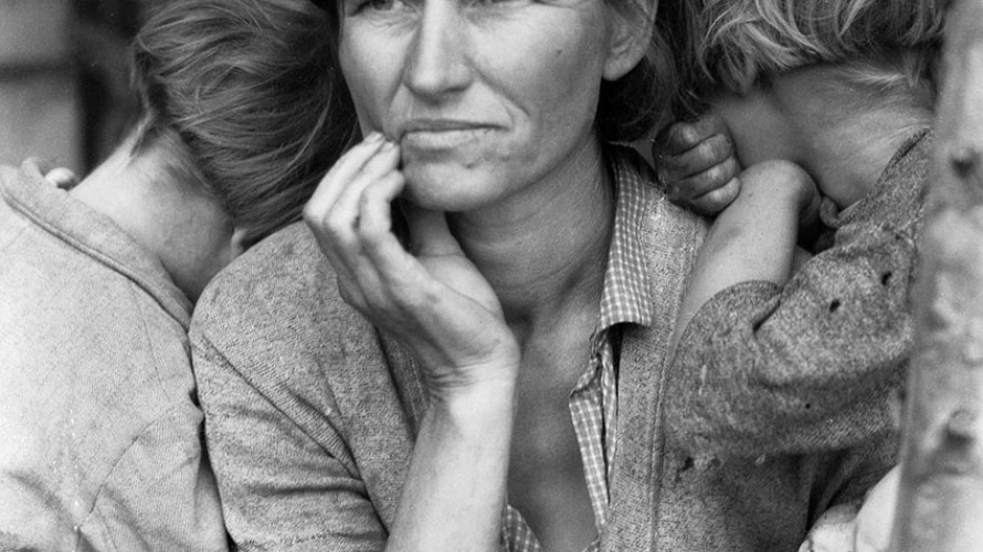 Oui. Dorotha Lange, c’est l’auteure de cette photo iconique de 1936 : la mère Courage. « The migrant mother » en anglais. C’est le regard soucieux de cette femme qui nous attire immédiatement. Les sourcils froncés, les yeux lointains, elle semble rongée d’inquiétude. Deux enfants se tiennent appuyés contre ses épaules, leurs visages sont cachés derrière elle. Ils donnent l’impression de dormir debout, d’être épuisés de fatigue. A leurs cheveux en bataille et à leurs vêtements troués, nous comprenons qu’ils sont pauvres. Cette mère s’inquiète pour ses enfants, pour leur avenir, pour leur prochain repas. Mais malgré tout, elle reste digne et c’est ça qui la rend admirable.