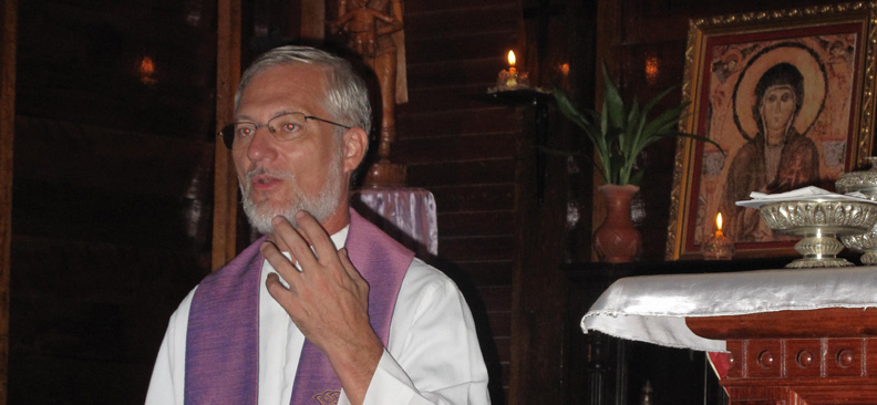 ©RCF - Le père Vogin devant un Christ Pantocrator représenté assis sur une fleur de lotus, symbole d'élévation spirituelle en Asie