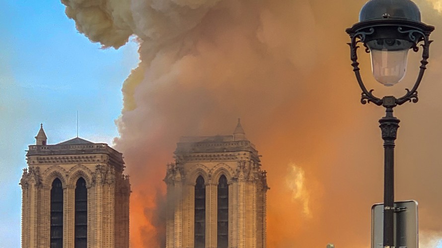 Il est 18h50, quand les premières fumées s'échappent du toit de la cathédrale. Les combles prennent feu, et embrasent la flèche, qui s'effondre d'elle-même quelques minutes après. Plus de 400 pompiers sont mobilisés pour tenter d'éteindre l'incendie qui se propage rapidement. Armés de leurs lances, les sapeurs-pompiers de Paris se battent héroïquement contre les flammes pendant toute la nuit. Au petit matin, le feu est maitrisé, mais le constat est terrible. La flèche n'est plus là, la toiture entièremement ravagée par les flammes, et la charpente largement grignotée par l'incendie. Seules la facade, et les 2 tours restent debout, malgré des dégâts considérables. A l'intérieur, une bonne partie du trésor a été sauvegardée. Le président de la République a appelé à une union nationale et au lancement d'une souscription nationale.