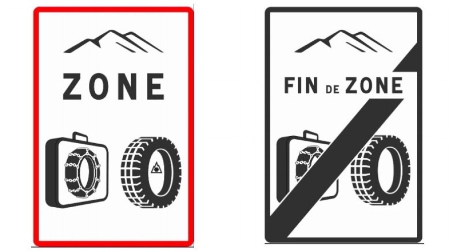 Une signalisation routière sera mise en place pour indiquer aux automobilistes s'ils entrent dans une zone où les pneus hiver sont obligatoires. Le panneau B58 (ci-dessus) signalera l'entrée de zone d’obligation d’équipements en période hivernale. Le B59 (ci-dessus) marquera la sortie de zone d’obligation d’équipements en période hivernale.