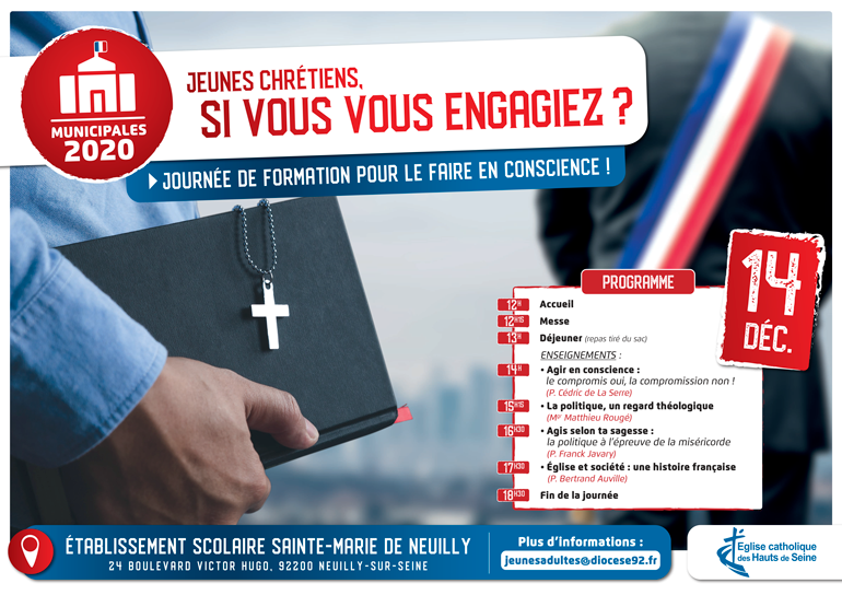 Les élections municipales approchent. Et les chrétiens, tout comme n’importe quel citoyen français, sont appelés aux urnes. Voter c’est bien, mais s’engager c’est mieux. C’est ce que le diocèse de Nanterre appelle à faire, à l’occasion d’une journée de formation intitulée "Jeunes chrétiens, si vous vous engagiez ?". Une journée de formation qui se tiendra le 14 décembre prochain dans l’établissement scolaire Sainte-Marie-de-Neuilly.