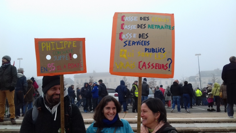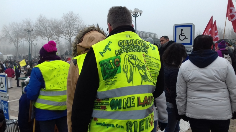 « De l’argent, il y en a, dans les caisses du patronat, pour nos retraites, pour nos emplois », scande un militant de Lutte ouvrière, mégaphone à la main. C’est aussi ce que pense Frédéric, gilet jaune à Angers, au chômage depuis peu. Il est venu manifester avec sa femme et ses trois enfants.