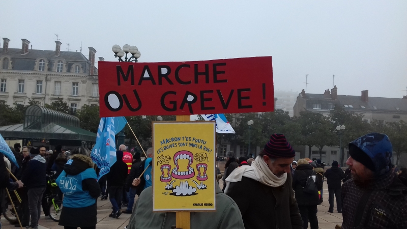 Au départ du cortège à Angers, place Leclerc, Fabrice brandit une pancarte « Marche ou grève ». Enseignant en primaire à Juigné-sur-Loire, il vient manifester « tout simplement pour défendre [son] pouvoir d’achat quand [il sera] en retraite ».
