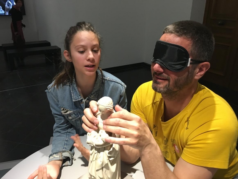 RCF 69 - L'Art et la MatièreLes yeux bandés, ils se laissent guider par leur binôme. En ce jeudi, accompagnés par une médiatrice culturelle, les visiteurs palpent, touchent, auscultent les statues dans la salle, du bout des doigts. Une façon originale de (re)découvrir les oeuvres, en délaissant la vue pour le toucher.
