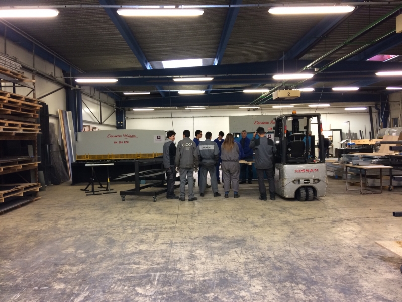 Vendredi 9 décembre : ateliers Bonhomme à Montélier, des élèves de première avec l’aide de Fernand Greco, de leur professeur de métallerie et du responsable de l’atelier ont découpé et plié les bras et les jambes des sculptures monumentales.