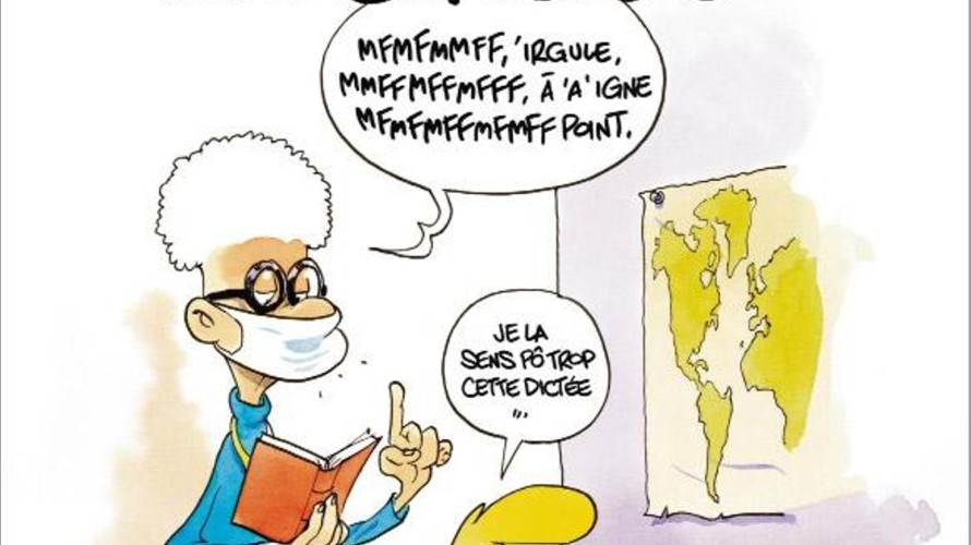 Pour illustrer la nécessité de respecter des distances entre les personnes, Titeuf est dessiné à l’école avec un de ses amis qui porte un appareil dentaire et qui postillonne, en disant avec un cheveux sur la langue « Difftanfiafion fofiale ». C’est assez amusant et pédagogique à la fois. Sur un des dessins, on voit Titeuf et ses camarades de classe en pleine dictée. Leur institutrice porte un masque et tente d’articuler les mots du texte… sans succès ….sdfskwjhflskjfhlws " Je ne la sens pas trop cette dictée ! », s'amuse Titeuf.