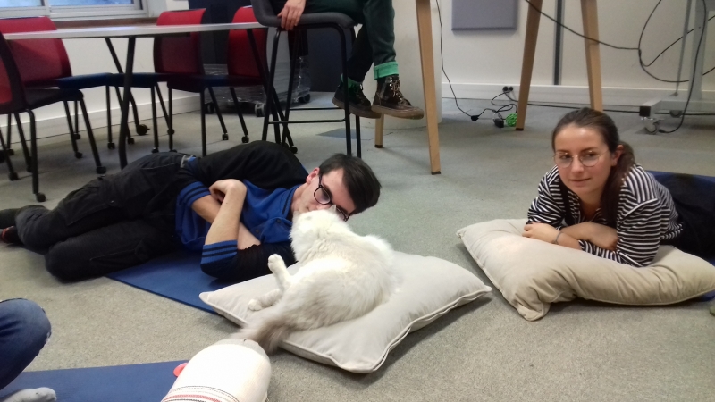 Dans une salle de la BU, tables et chaises ont été poussées pour faire de la place à des tapis et des coussins. Allongés ou assis en cercle, six étudiants chuchotent sur fond de musique douce, agrémentée de ronronnements.