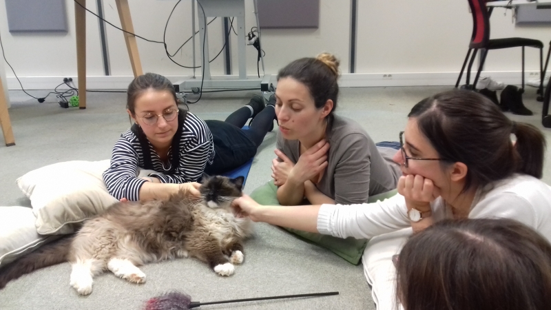 Sur les trois chats ragdolls qui se baladent dans la pièce, deux viennent s’allonger tout près des étudiants pour se laisser caresser. « C’est une race très sociable », explique Lucile Civel, intervenante en médiation par l’animal.