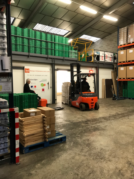 A ST-Etienne, dans le quartier de Montreynaud l'entrepôt abrite un stock imposant permettant d'aider 20000 bénéficiaires par l'intermédiaire d'une soixantaine d'associations.
