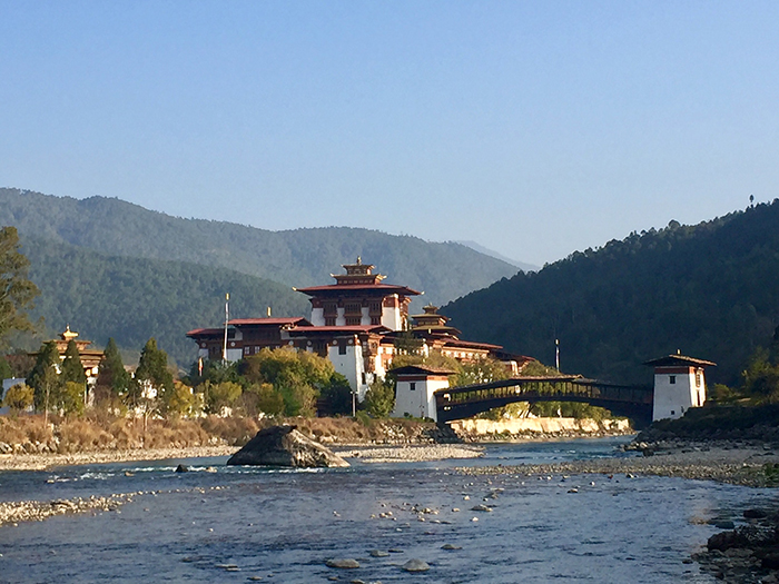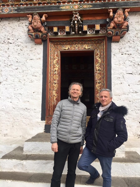 À peine arrivé à Paro, sur l'unique aéroport international du Bhoutan, enchâssé entre deux montagnes, Robert Dompnier nous emmène dans le dzong de Paro, qui domine la vallée. Les dzong sont des forteresses qui accueillent à la fois l'administration du pays et un monastère bouddhiste. Celui de Paro a été construit en 1646.