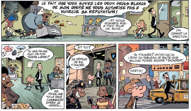 Tome 9 Road'n'Trip. En suivant la journaliste Balconi qui veut réaliser un reportage sur l’exploitation d’une nouvelle énergie, le gaz de Shit, Spoon se retrouve à MudTown, petite ville perdue du Kentucky. Il y a « grandi » et sa famille y vit encore. Bête comme ses pieds, il est persuadé que Balconi est venue dans ce trou paumé pour demander sa main à son père. Autant vous dire que tout va dès lors partir en vrille. Spoon & White est un petit plaisir coupable de ces « buddy BD » ! Littéralement, la bande dessinée de potes par excellence avec deux personnages que tout oppose ! Le duo explosif est de retour chez l'éditeur Bamboo après plus de 10 ans de silence ! Une première partie d'album très réussie avant de retomber un peu - avec un peu plus d’action à l’image de la couverture nerveuse rappelant le dernier Mad Max - Fury Road et donc un peu moins de gags. On peut ne pas partager l'humour de ce genre de bande dessinée de divertissement, mais pour les amateurs de parodies loufoque, cette série est pour vous ! Et même si ce nouvel album n’est pas le grand cru espéré, on ne boude pas du tout le plaisir de retrouver nos deux déglingos de flics new-yorkais.
