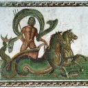 • Triomphe de Neptune, debout sur un char tiré par deux chevaux marins (hippocampes). Mosaïque d'Hadrumète (Sousse) du milieu du IIIe siècle ap. J.-C.  © Wikipedia.